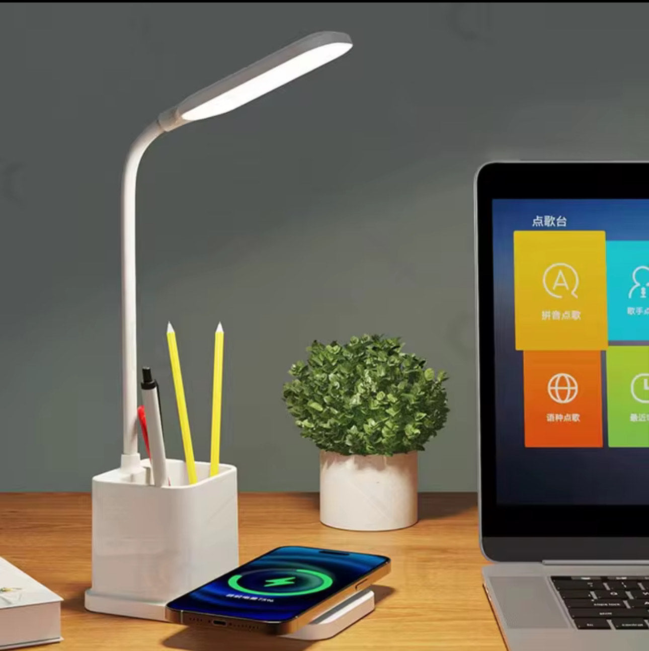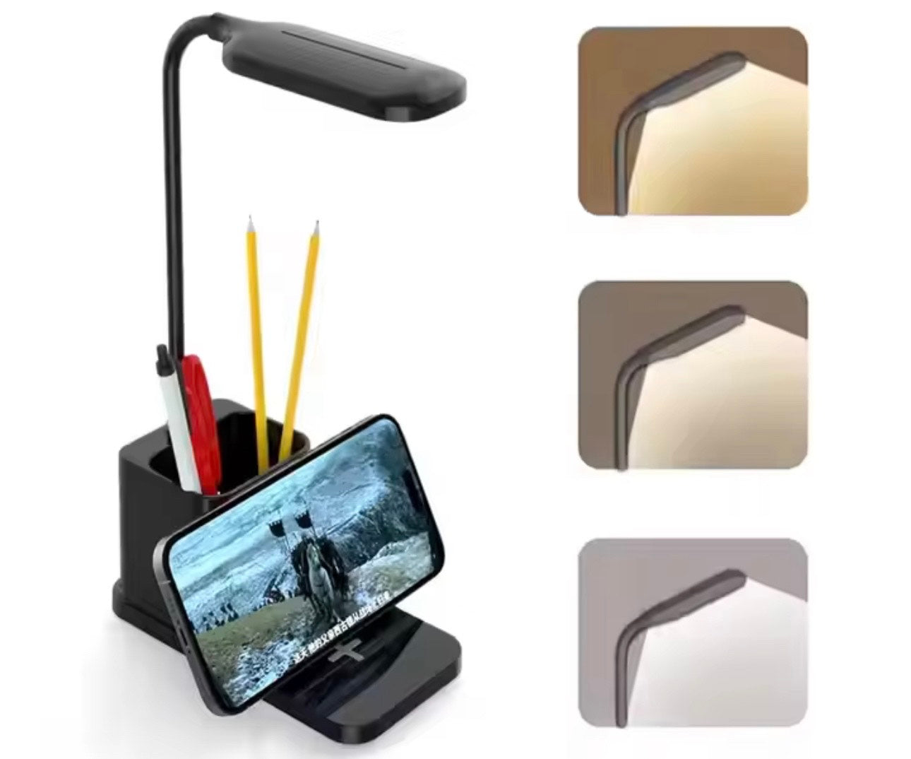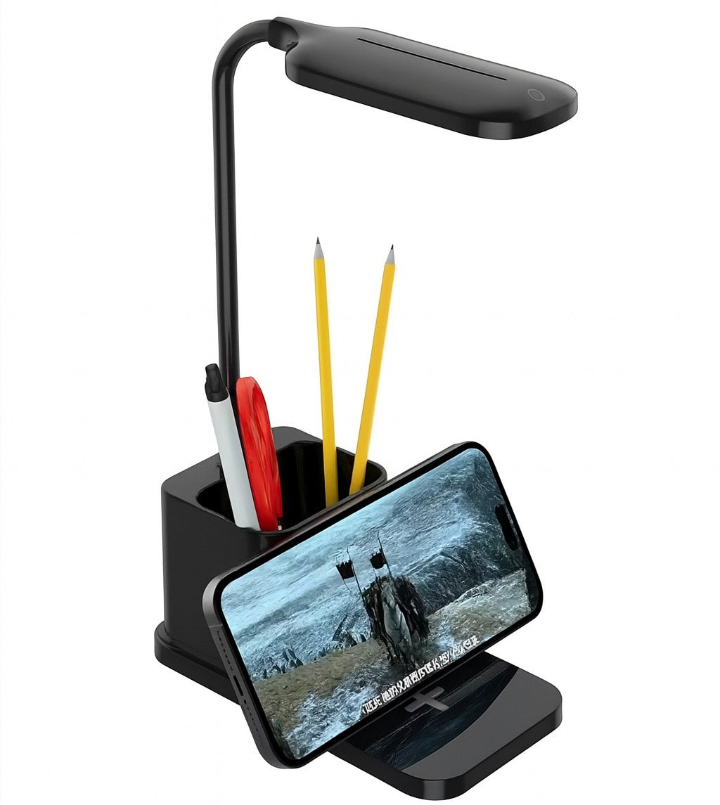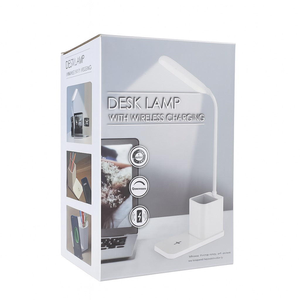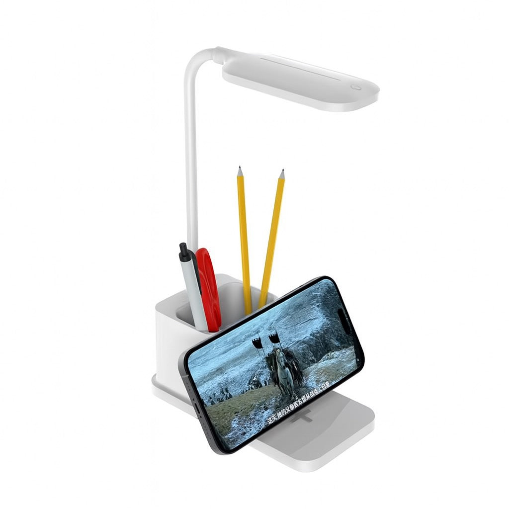 Ilumina, organiza y carga sin cables. Una sola lámpara, tres soluciones: Cargador inalámbrico rápido Luz LED regulable (cálida / neutra / fría) Portalápices integrado